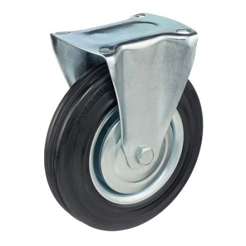 Колесо неповоротное 4002-200, диаметр 200мм., грузоподъемность 185кг. Колеса из черной литой резины, центр из двух гальванизированных дисков из штампованной стали. Роликовый (игольчатый) подшипник расположен в углублении, выдавленном под прессом, и содержит цилиндрические ролики подшипника. Неповоротный кронштейн изготовлен прессованием из листовой стали. Возможно применение на относительно грубых полах складов, заводов, производственных и строительных площадках. Данные колеса можно использовать на неровных поверхностях, во влажной окружающей среде и использовании вне помещения, не рекомендуется применять в среде с органическими растворителями, хлорированными веществами, гидрокарбонатами и минеральными маслами. Температура эксплуатации от -20 до +70С.