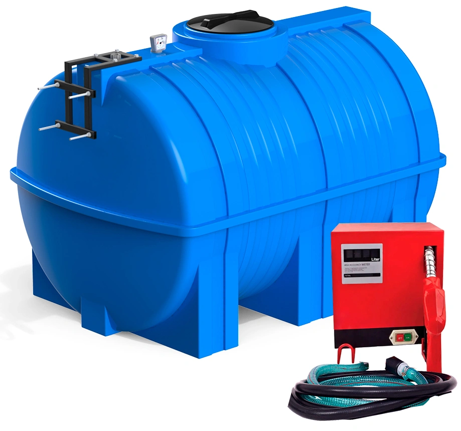 Бак выполнен из прочного полиэтилена и усилен продольными рёбрами жёсткости, что делает его устойчивым к внешним нагрузкам и деформациям при эксплуатации. Заправочный модуль подключается к электросети и обеспечивает стабильную подачу топлива с учётом расхода.