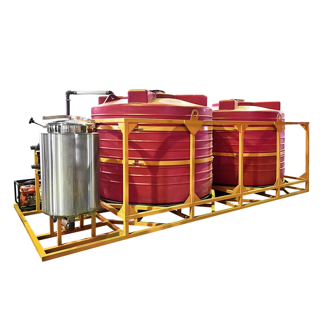 Каркас узла выполнен из прочного металла, рассчитан на регулярную транспортировку по полевым дорогам и выдерживает многократную погрузку и выгрузку. Металлическая обвязка исключает движение и износ ёмкости в процессе работы, а усиленное основание предотвращает провисание. Для удобства предусмотрены монтажные петли под кран.