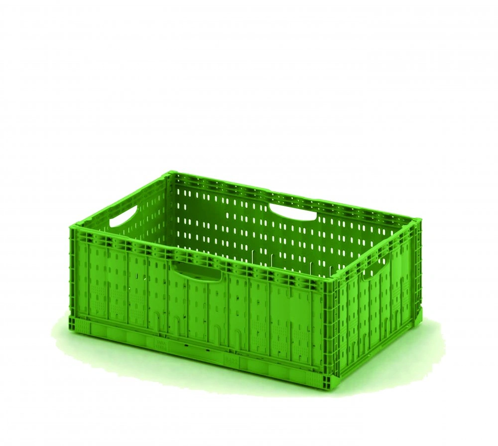 Контейнер отлично подходит для выкладки различной продукции в торговых залах магазинов. Отлично подойдет для использования в качестве многооборотной тары в пулинговых схемах. Складной ящик изготовлен из первичного полипропилена, имеет перфорированные стенки и дно, а также удобные ручки по всем четырем сторонам. пустых ящиков.