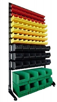 Стенд разработан специально для систематизации, хранения различных комплектующих, деталей, запчастей, крепежных и строительных материалов: болты, гайки, сверла, подшипники, метизы, фитинги, сантехника, зажимы, заклепки и т.д.