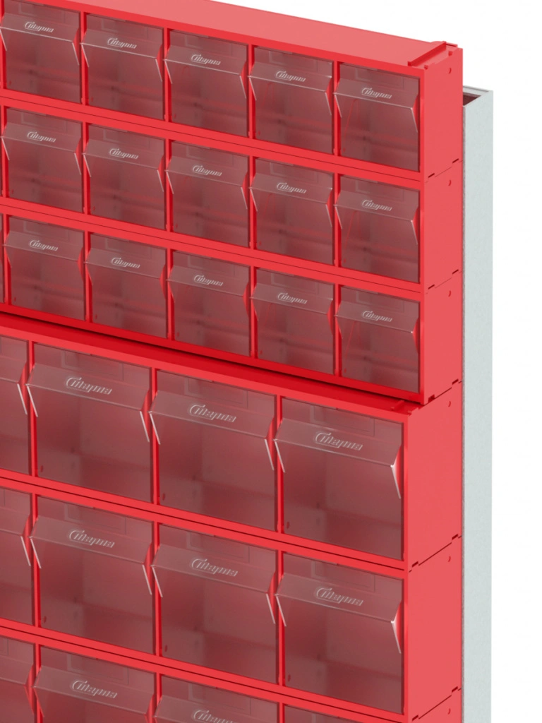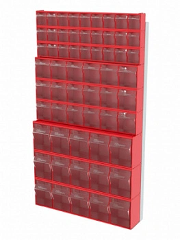 Стойка настенная Стелла-техник 402-03-03-03 (610х40х1000) представляет собой удобную систему хранения на основе откидных коробов, которая подойдет для использования в выставочных залах, магазинах, складах. Стойка крепится на стену при помощи саморезов или анкерных болтов (крепеж не входит в комплект и подбирается под уровень загруженности стойки). Комплектация: Рама FOX (610х40х1000) V402 - 1 шт.; Короб откидной Стелла-техник F-600-9 , 600х68х78мм, 9 ячеек, красный, прозрачный - 3 шт.; Короб откидной Стелла-техник F-600-6 , 600х96х112мм, 6 ячеек, красный, прозрачный – 3 шт.; Короб откидной Стелла-техник F-600-5 , 600х140х168мм, 5 ячеек, красный, прозрачный – 3 шт.; Упаковка. Преимущества: Металлическое основание; Значительная устойчивость; Хорошая вместимость; Длительный срок службы.