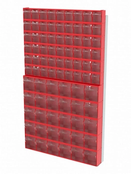 Стойка настенная Стелла-техник 402-06-05-00 (610х40х1000) представляет собой удобную систему хранения на основе откидных коробов, которая подойдет для использования в выставочных залах, магазинах, складах. Стойка крепится на стену при помощи саморезов или анкерных болтов (крепеж не входит в комплект и подбирается под уровень загруженности стойки). Комплектация: Рама FOX (610х40х1000) V402 - 1 шт.; Короб откидной Стелла-техник F-600-9 , 600х68х78мм, 9 ячеек, красный, прозрачный - 6 шт.; Короб откидной Стелла-техник F-600-6 , 600х96х112мм, 6 ячеек, красный, прозрачный – 5 шт.; Упаковка. Преимущества: Металлическое основание; Значительная устойчивость; Хорошая вместимость; Длительный срок службы.