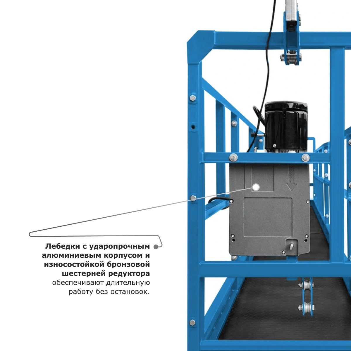 - Металлический отвод троса обеспечивает надежную защиту корпуса люльки и самого троса от протирания и повреждений.