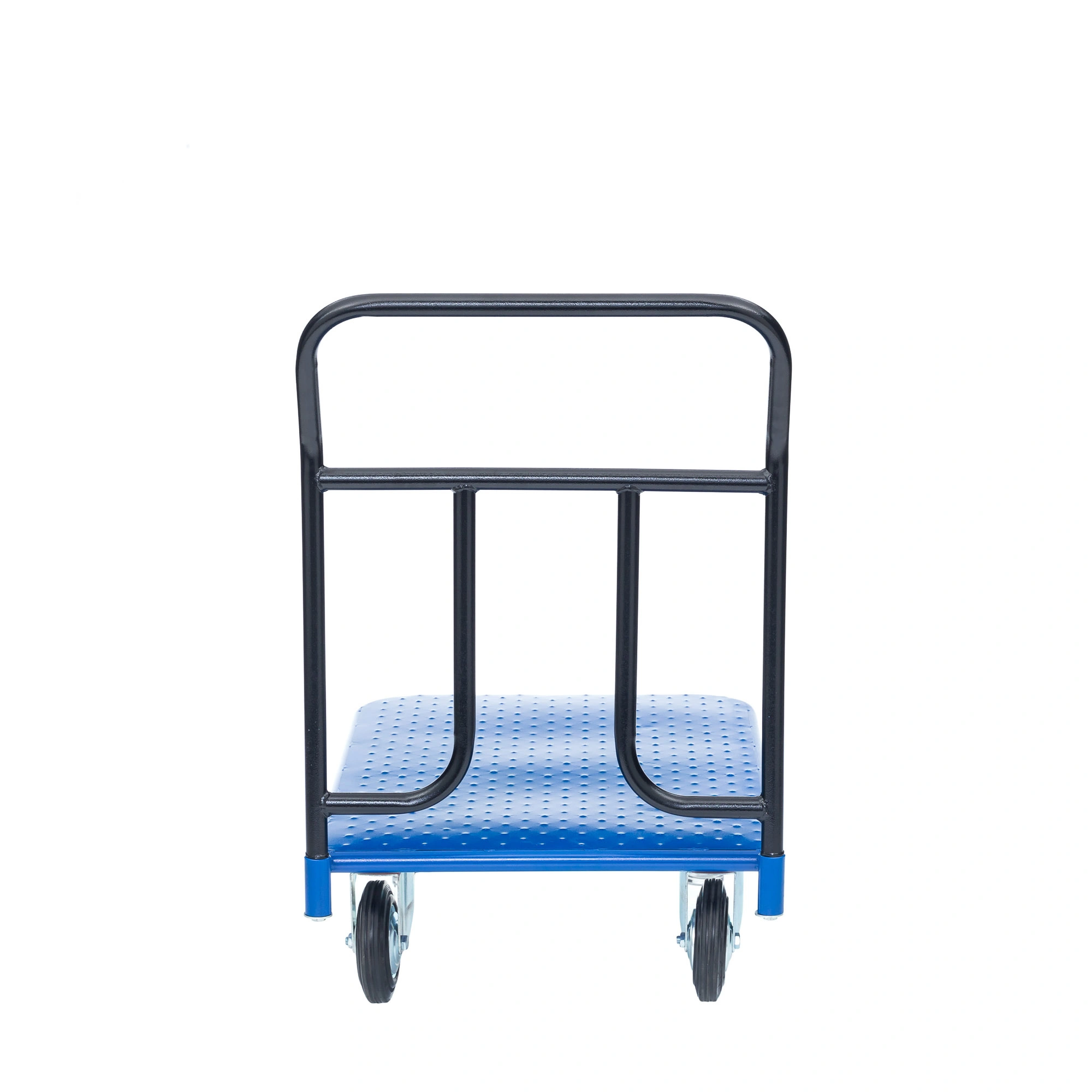Платформенная 4-х колесная тележка КП-400-150-И используется для перемещения различных грузов в складских помещениях. Ручка крепится к платформе болтами, для компактного хранения можно снять, высота ручки 750мм. Платформа имеет уникальную рельефную, полимерную, противоскользящую поверхность, размером 700х1000мм. Цвет - синий, шагрень. Тележка комплектуется: метизами для крепления, двумя поворотными и двумя неповоротными промышленными колесами, диаметром 150мм., из черной стандартной резины, от всемирно известного, ведущего итальянского производителя Tellure Rota. Грузоподъемность до 450кг.