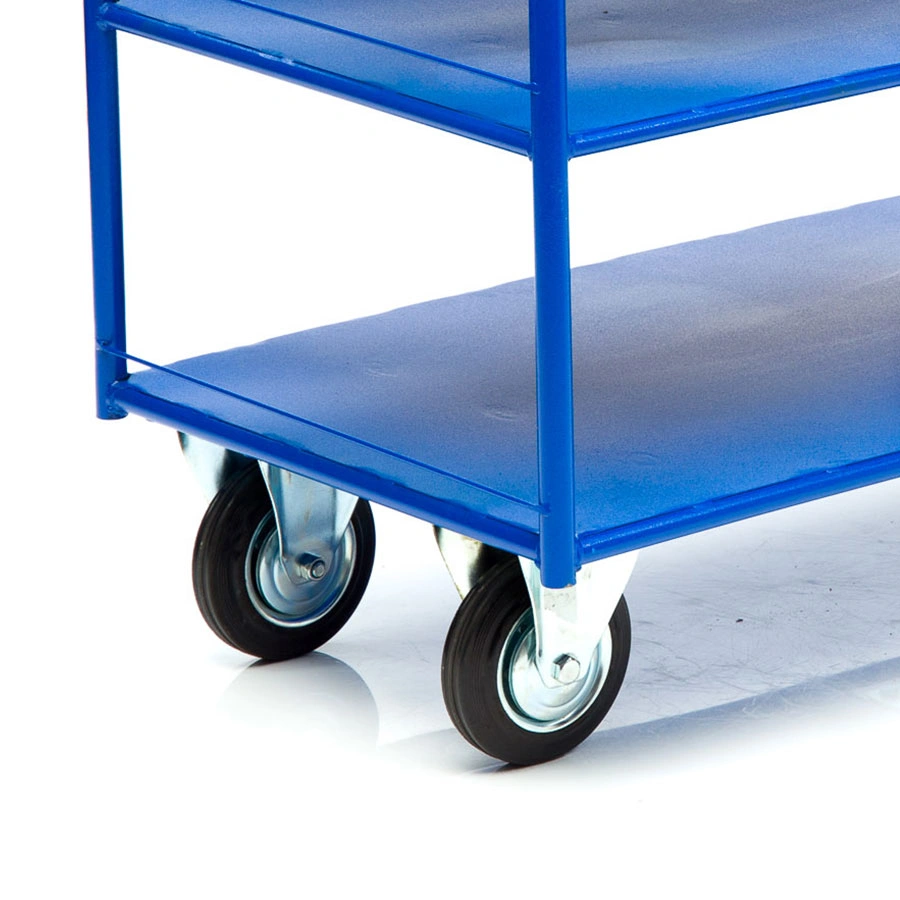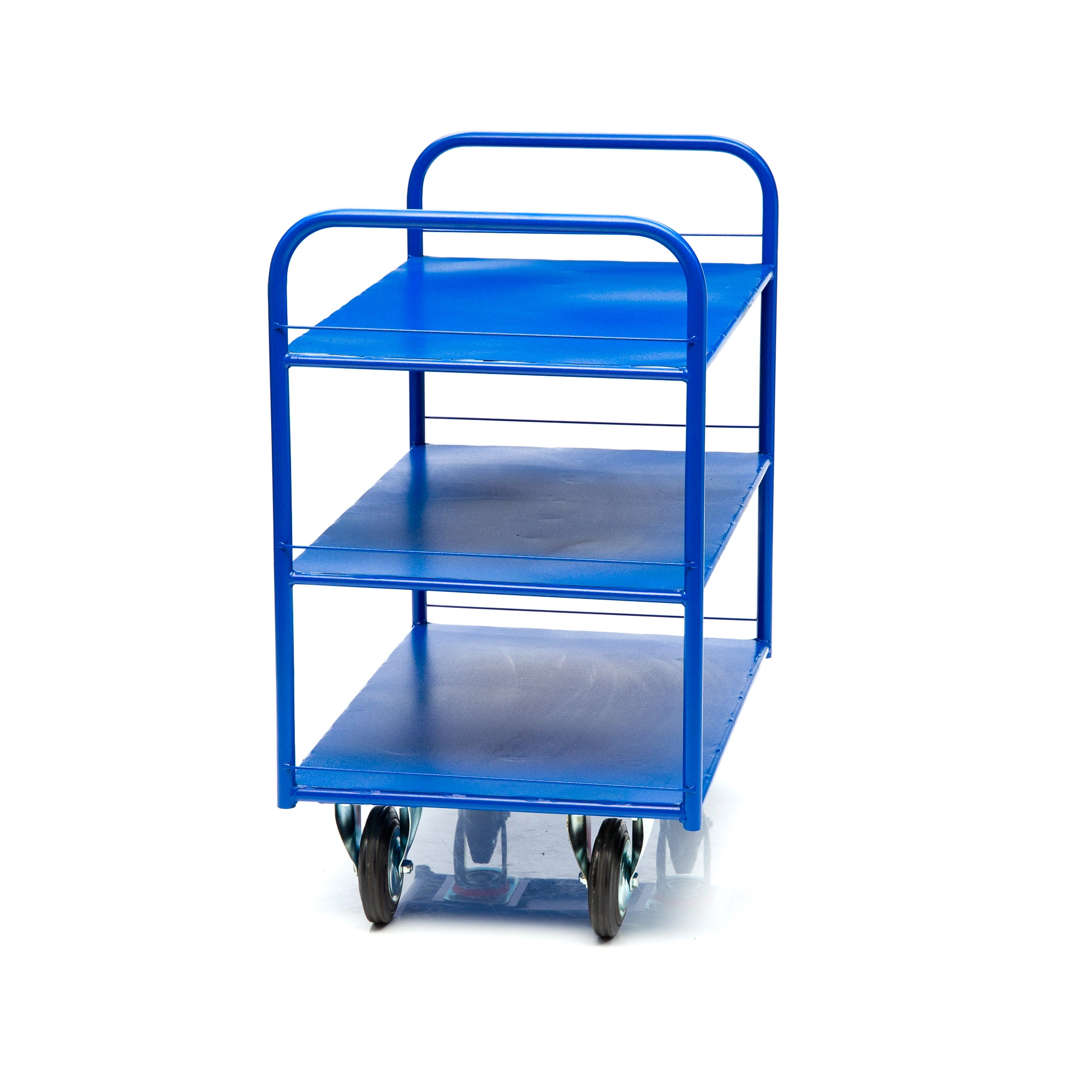 Платформенная трехъярусная 4-х колесная тележка КР-3-160-К предназначена для перевозки малогабаритных грузов. Платформа металлическая толщина листа 1,2мм. Размер платформы 600х900мм. Расстояние между ярусами 300мм. Количество ярусов 3 шт. Габаритная высота 1000мм. Покрытие полимерное. Цвет - синий, шагрень. Тележка КР-3-160-К оснащена: двумя поворотными и двумя неповоротными колесами, диаметром 160мм., изготовленными из высококачественной литой резины, что обеспечивает простоту и легкость перемещения тележки, метизами для крепления. Благодаря наличию трех ярусов, тележка широко используется на складах, в торговых павильонах, а также в гостиничном и ресторанном бизнесе. Грузоподъемность до 400кг.